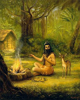 Days, months, and years passed. One day, a deer came to drink water nearby where the royal sage was meditating. At the same moment, a lion roared at a little distance off. The deer was so terrified that she, without satisfying her thirst, made a big jump to cross the river. The deer was with young, and this extreme exertion and sudden fright made her give birth to a little fawn, and immediately after she fell dead. The fawn fell into the water and was being carried rapidly away by the foaming stream, when it caught the eyes of the king. The king rose from his position of meditation and rescuing the fawn from the water, took it to his cottage, made a fire, and with care and attention fondled the little thing back to life. Then the kindly sage took the fawn under his protection, bringing it up on soft grass and fruits. The fawn thrived under the paternal care of the retired monarch, and grew into a beautiful deer. Then, he whose mind had been strong enough to break away from lifelong attachment to power, position, and family, became attached to the deer which he had saved from the stream. As he became fonder and fonder of the deer, the less and less he could concentrate his mind upon the Lord. When the deer went out to graze in the forest, if it were late in returning, the mind of the royal sage would become anxious and worried. He would think, "Perhaps my little one has been attacked by some tiger -- or perhaps some other danger has befallen it; otherwise, why is it late?"